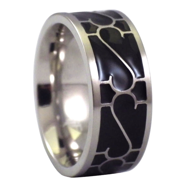 It has an 8mm wide comfort fit inner band. The center has a filigree relief with a glossy black background making the design pop! Available in ring sizes 6, 7.5, and 12.