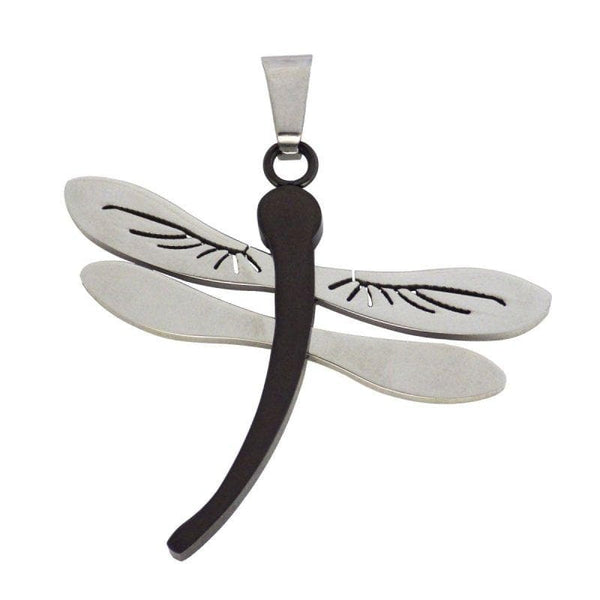 The dragonfly pendant is made of hypoallergenic stainless steel. It has a unique hypoallergenic black finish that will look great day or night. The stainless steel pendant measures 1 3/4 inches wide from wingtip to wingtip. The body measures 1 1/2 inches tall without the bail.