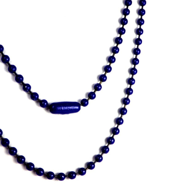 - This ball chain has a satin blue powder coat plating, is 2.5mm wide, and has a traditional locking ball chain clasp.