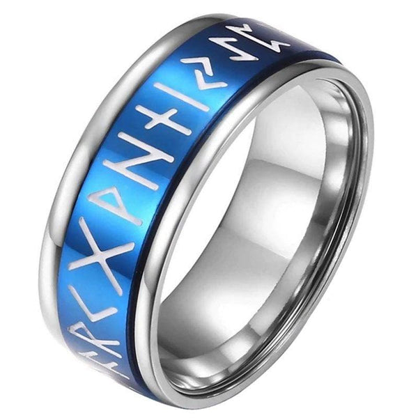 This blue Viking rune spinner ring is designed for those moments when you need to relax, relieve stress, tension, and worry. The blue runes band will spin around the inner band, giving you something to fidget.