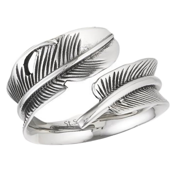 This beautiful boho-style feather ring is very comfortable to wear as a thumb ring or an everyday fashion ring. The wrap-around feather ring band is made of hypoallergenic stainless steel. This feather ring measures 17.5mm wide and narrows down to 8.5mm wide at the back of the band.