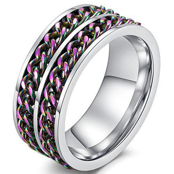 This double rainbow chain spinner ring is designed for those moments when you need stress relief, relaxation, relief of tension, calm your nerves, or focus. The rainbow PVD plated chains will spin around the band together or independently, giving you something to fidget.
