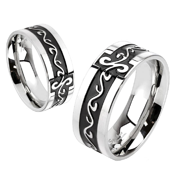The stainless steel ring band has a high polish finish with a black background. The women's 6mm wide ring is available in sizes 5 and 8, while the men's 8mm wide ring is available in sizes 9, 10, 11, 12, and 13.