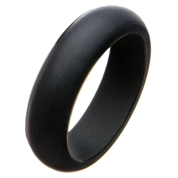 A rubber silicone ring is a durable, nonconductive alternative to traditional metal wedding bands. This men's and women's 6mm wide black silicone wedding ring is a flexible piece of modern jewelry featuring a breakaway style band. This stylish silicone wedding band is available in ring sizes 7 and 8.