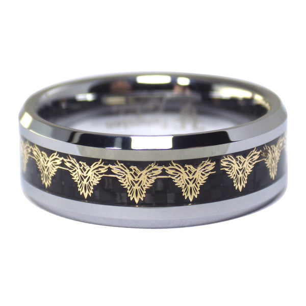 A special edition firebird phoenix tungsten ring with a gold-colored firebird phoenix design with black carbon. The silver color tungsten ring is 8mm wide and comes with a comfort fit inner band. Available in sizes 5, 6, 6.5, 7, 7.5, 8, 8.5, 9, 9.5, 12, 13, 14, 15, 16, and 17.