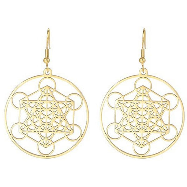 Gold Metatrons Cube Earrings Stainless Steel Sacred Geometry Dangles