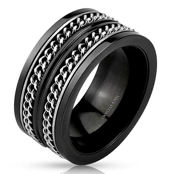 The Gothic black double chain spinner ring is made of solid, hard to bend, hypoallergenic 316L surgical stainless steel.