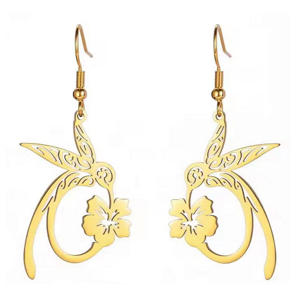 The hummingbird is seen as a messenger of joy, symbolizing intelligence, beauty, devotion, and love. Despite their small size, these birds are also admired for their fighting spirit and resilience. These beautiful hummingbird earrings are made of solid hypoallergenic 316L surgical stainless steel. They are dangle or drop style with hook fastenings. The hummingbird earrings have a high polish gold color PVD finish and measure approximately 36mm long by 26mm wide by 1mm thick (one earring without ear-wire, charm only). One earring with ear wire weighs approximately 2 grams. The package will contain one pair. A gift box is included with the purchase. SKU: FFJ-SSE-251