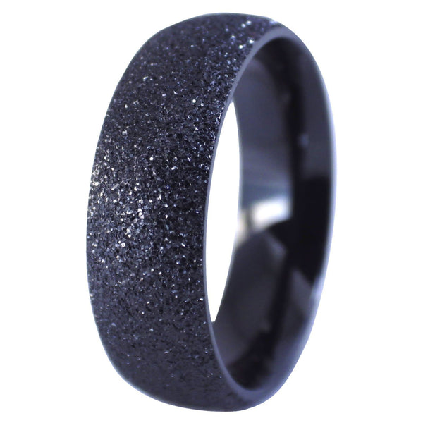 This black stainless steel ring with a sandblast textured glitter finish catches the light just right. The hypoallergenic 316L surgical stainless steel ring will make a nice modern fashion ring or wedding band. The sandblasting process gives it a sparkling or glitter effect and texture that is eye-catching.