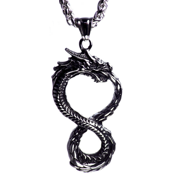This unique infinite ouroboros necklace is made of solid 316L surgical stainless steel.