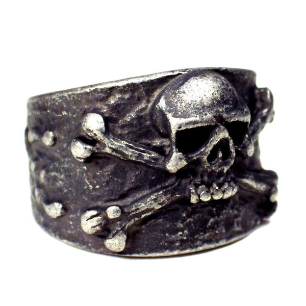 The Jolly Roger has a unique dark antiqued satin finish and approximately measures 16mm wide at the front center down to 9mm wide at the back of the band.