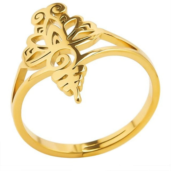 The Boho lily band has a high-polish gold color PVD finish and measures approximately 18mm wide at the front center by 2mm wide at the back of this adjustable band.