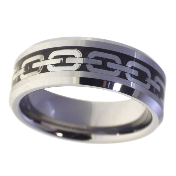 The men's tungsten ring has a silver chain pattern inlay around the outside of the band. Available in a ring size 13.