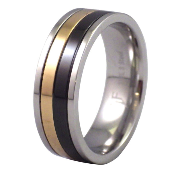This triple-tone men's ring is sophisticated and looks stunning day or night. The comfort fit 8mm wide band has a high polished gold, black and stainless steel finish. The combination of the three colors creates a head-turning everyday casual ring or wedding band.