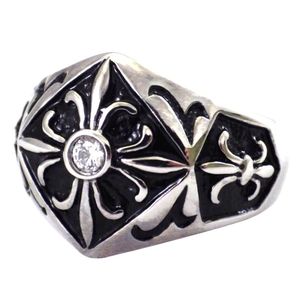 The stainless steel ring has one small clear 3mm clear cubic zirconia or CZ stone that adorns the center, and it measures 16.5mm at the widest point to 4.7mm wide at the back of the band. The Fleur De Lis theme continues from the CZ stone setting to the sides of the band. Available in sizes 10, 11, 12, 14, and 15.