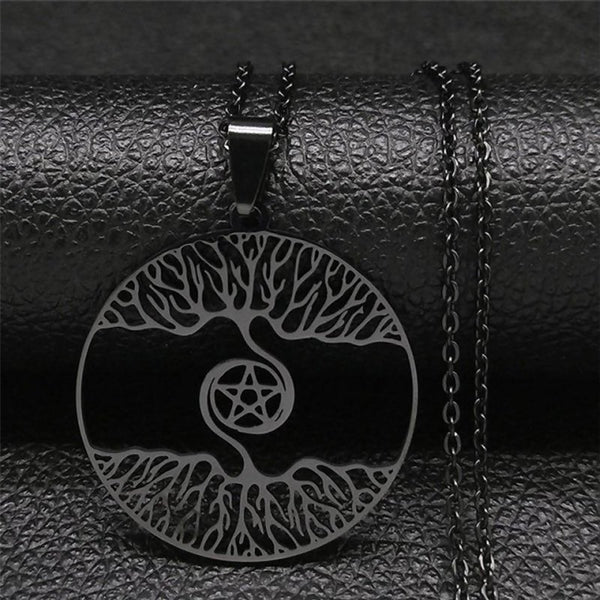 This Norse Yggdrasil necklace or Viking Pagan pentacle amulet is made of solid hypoallergenic stainless steel. The Norse tree of life pendant has a high polish black color PVD finish and approximately measures 35mm in diameter by 1.4mm thick. The bail can accommodate a chain or cord up to 3.5mm wide.