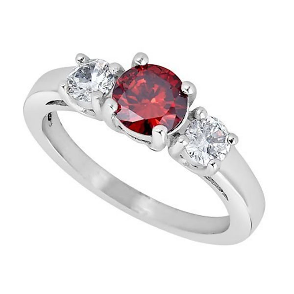 The hypoallergenic stainless steel ring band is 2.5mm wide with a high polish finish. The 6mm round cut deep red garnet color cubic zirconia is adorned on each side by two smaller 4mm white CZ stones. This women's stainless steel ring can be an everyday fashion ring, a past, present, and future ring, a January birthstone ring, or a red cubic zirconia engagement ring. Available in sizes 3, 4, 5, 6, 7, 8, 9, and 10.