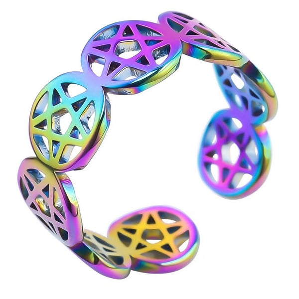 The pentacle ring is made of solid hypoallergenic 316L surgical stainless steel, it is 7mm wide and has a high polish rainbow PVD finish.