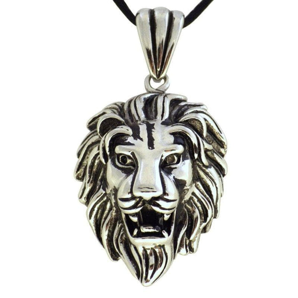 The roaring lion stainless steel pendant approximately measures 2 3/8 inches (60.2mm) tall x 1 1/4 inches (32mm) wide x 3/4 inch (19mm) thick. It comes ready to wear on a 28-inch adjustable black satin cord necklace.