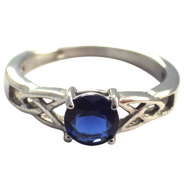 The Celtic knot ring has one round 6mm brilliant-cut blue sapphire color cubic zirconia that feels refreshing as it sparkles in the light. A CZ stone or cubic zirconia is a lab-created diamond. The CZ stone is held in place by a secure four-prong setting.