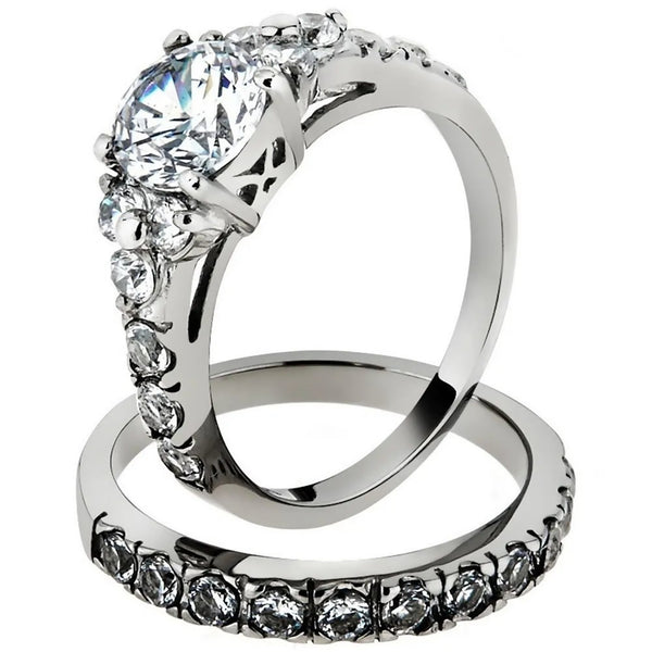 The first band is a solitaire with accents, the center stone is a 6mm round brilliant cut clear cubic zirconia in a four-prong setting with a total of twelve 2mm round clear cubic zirconia's on either side.