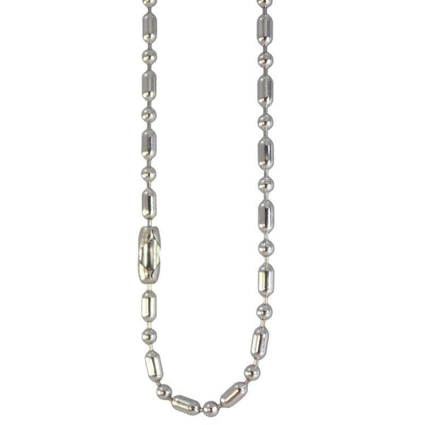 The high-polish finish will look great with a pendant or worn on its own. This ball and oval chain necklace has a traditional locking ball clasp and is available in 15, 16, 17, 18, 19, 20, 21, 22, 23, 24, 25, 26, 27, 28, 29, and 30-inch lengths. A stainless steel necklace is durable enough for everyday abuse and it will perform better than a silver chain.
