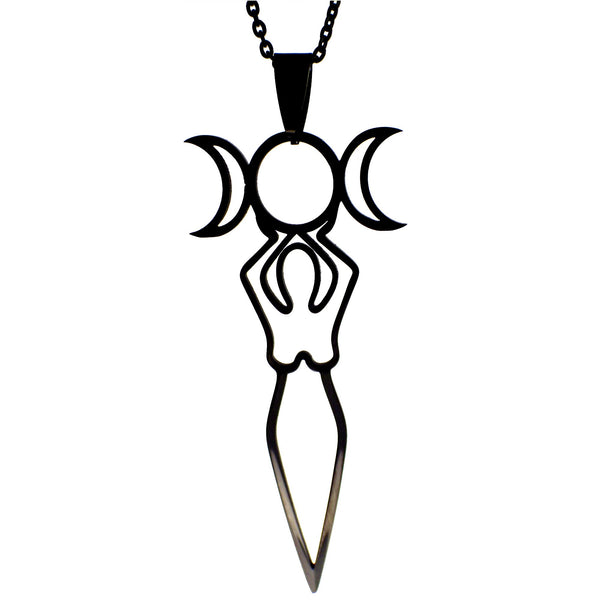This triple goddess pendant will arrive ready to wear on a 20-inch black stainless steel curb chain necklace.