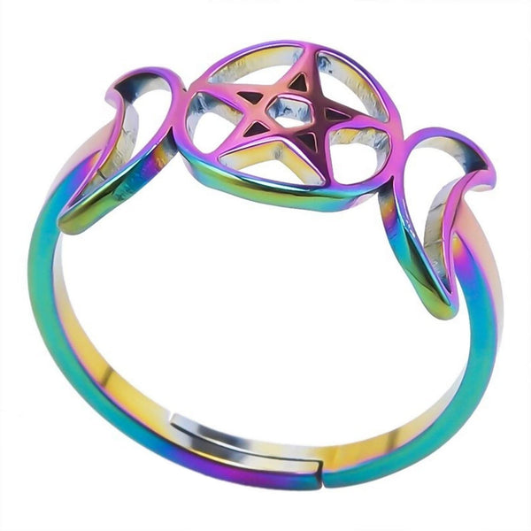 This beautiful rainbow triple goddess ring is made of solid hypoallergenic 316L surgical stainless steel.