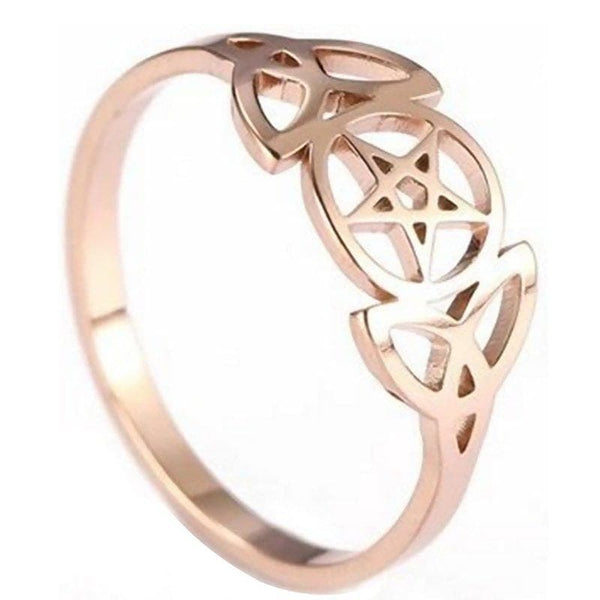 The triple goddess ring is made of solid hypoallergenic stainless steel and has a high polish rose gold color PVD finish.
