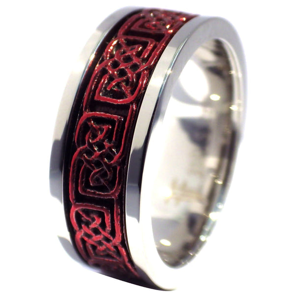 This hot spinner ring has a red Celtic knot centerpiece that can spin on the inner band. The red Celtic knot spinner ring is made of hypoallergenic stainless steel. This men's or women's ring has a high polish red PVD finish on the Celtic knotwork. The high polish band is 8mm wide and a comfort fit style. This Celtic spinner ring is made in sizes 5, 6.5, 7, 7.5, 8, 8.5, 9, 9.5, 10, 10.5, 11, 12, 13, 14, 15, 16, and 17.