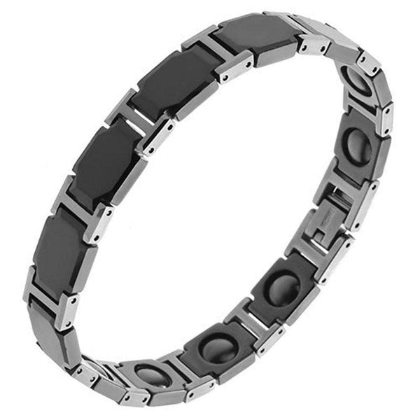 The bracelet is made of solid tungsten carbide, which is given a high polish finish. The black links are made of ceramic and are given a high-polish black PVD finish.