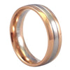 This 316L surgical stainless steel ring with rose gold edges is a modern color combination with a classic look as a wedding band. The wedding band is made of solid 316L surgical stainless steel. This men's and women's 316L surgical stainless steel ring is 6mm wide with a comfortable inner band. Available in ring sizes 12, 13, 14, and 15.