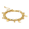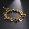 The celestial moon and stars charm bracelet or anklet has a high polish gold color PVD finish and can be adjusted between 6.5 and 8.5 inches in length.
