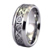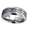 This beautiful men's and women's Celtic dragon ring has a silver knot inlay across a midnight black carbon fiber background. A Celtic dragon ring can be worn as an everyday fashion casual ring or as a tungsten wedding band. The tungsten ring band is 8mm wide with a comfortable fit.