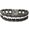 This killer rocker-style bracelet is made of solid stainless steel and black silicone. The stainless steel men's bracelet has a high polished finish with small black silicone accents creating a hardcore two-tone look. There is an easy-to-use fold-over snapping clasp that will securely keep it on your wrist.