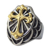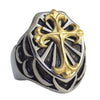 Want a bold cross ring? Here is a men's large shield ring with a raised gold fleur de lis cross centerpiece. This men's cross ring is made from hypoallergenic stainless steel, so it will not bend, rust, tarnish, or corrode.
