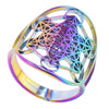 This sacred geometry ring is made of solid hypoallergenic 316L surgical stainless steel and has a high-polish rainbow PVD finish.