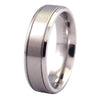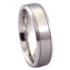 This modern stainless steel wedding ring has a 6mm wide comfort fit band. The center has a brushed finish with twin grooves, and the edges are high polished. Only sizes 12 and 13 are available.