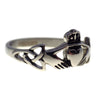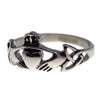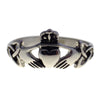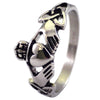 This specific Irish Claddagh ring has two Triquetras or Trinity knots on the sides of the band. It is made from hypoallergenic 316L surgical stainless steel and is safe to wear if you have sensitive skin and cannot wear sterling silver. The stainless steel ring measures approximately 10mm tall at the crown and 2.7mm wide at the narrowest point. This Claddagh ring is available in ring sizes 7, 9, and 10.