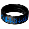 The Celtic band has a high polish black PVD finish and is engraved with rune symbols around the entire band, the runes are then filled with blue enamel.