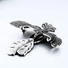 This Valkyrie or phoenix pendant has a high polish finish with antiquing to highlight the details and approximately measures 4.25 inches long by 3 inches wide (wingtip to wingtip), 0.25 of an inch thick.